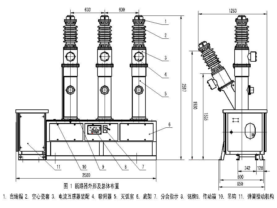 断路器的主要部件有:出线帽、空心瓷套、灭弧室、吸附器、电流互感器装配、传动箱、连杆、底架、CT14型弹簧操动机构。